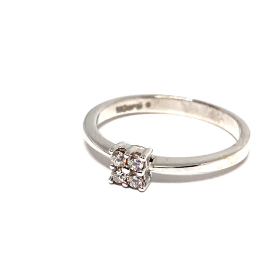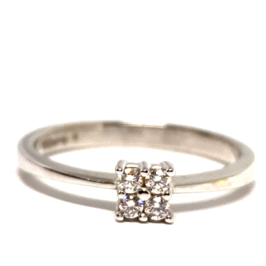 Anillo de compromiso de oro blanco de 18k con cuatro brillantes en el centro engastados en nueve garras, formando un cuadrado.