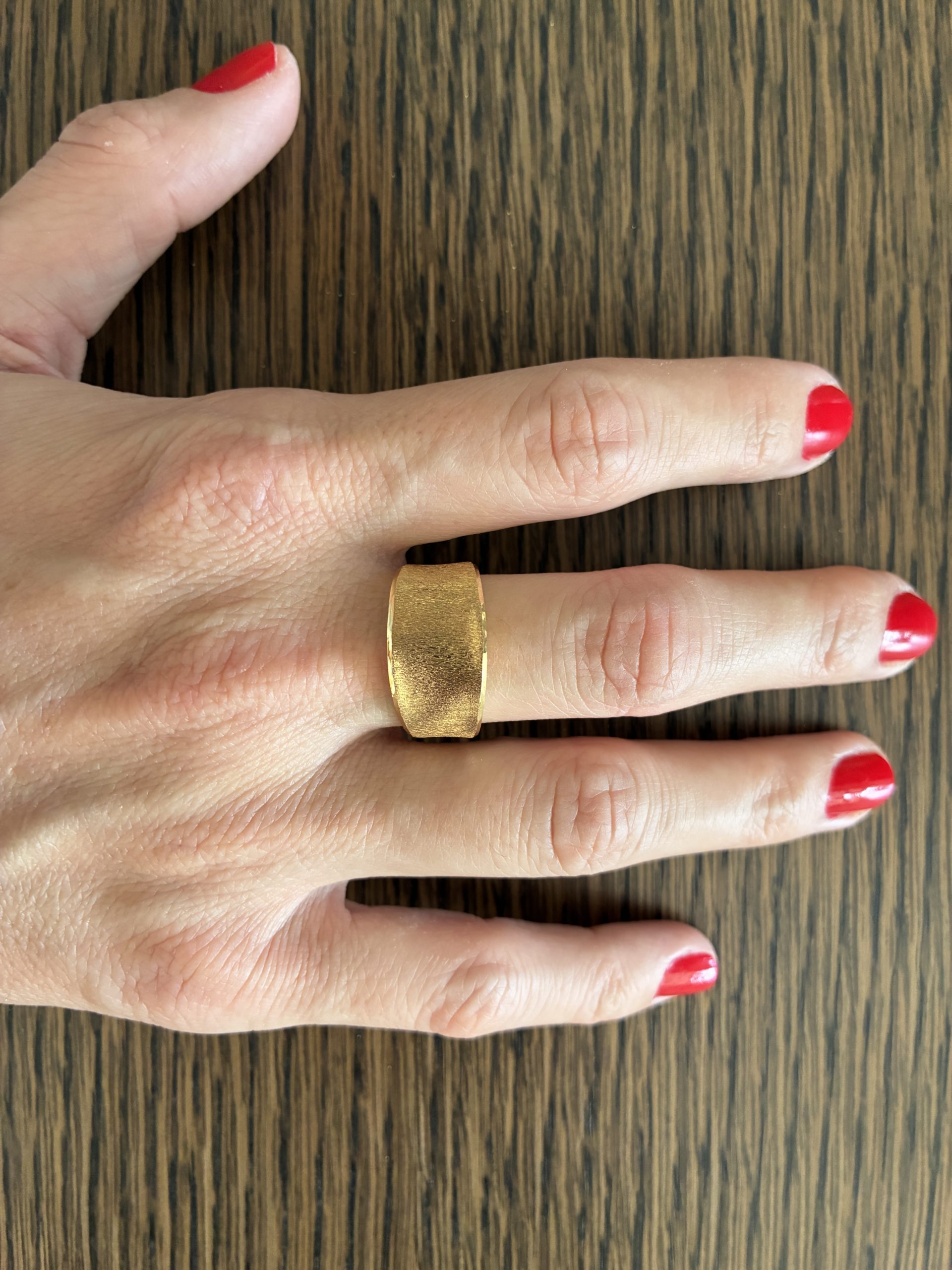 Sortija de oro amarillo de 18k con centro ancho y matizado y bisel en brillo.
