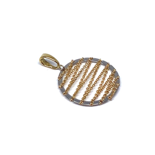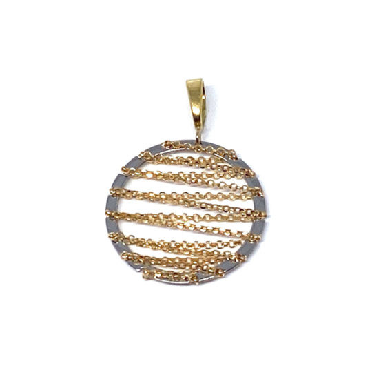 Colgante con forma de circulo y una cadenita que que hace un ziczac formando una malla, oro de 18k bicolor. Medidas: 20×20 mm.