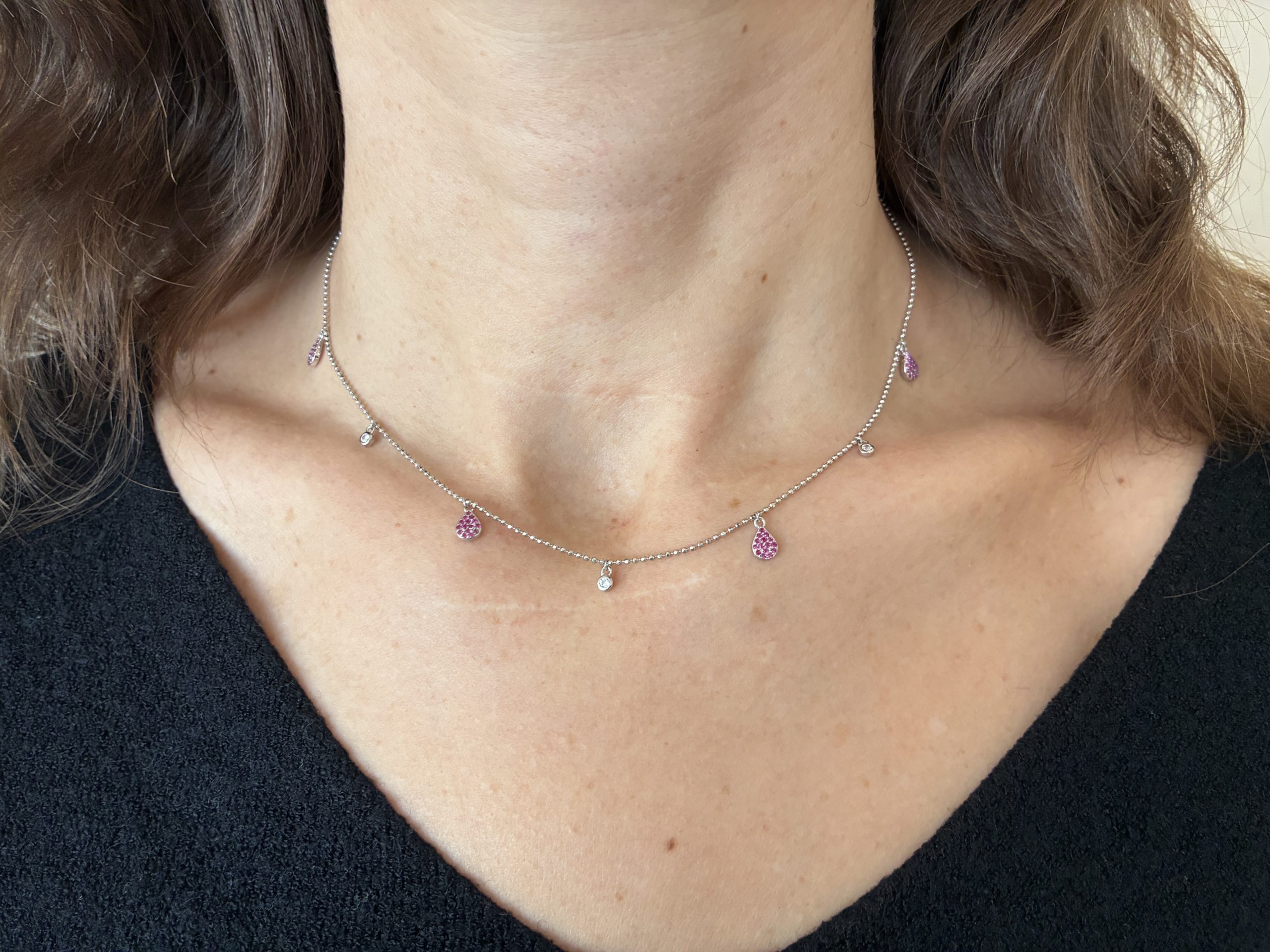 Collar de plata rodidado cadena bolitas con gotas rosa y chatones de circonita colgando.
