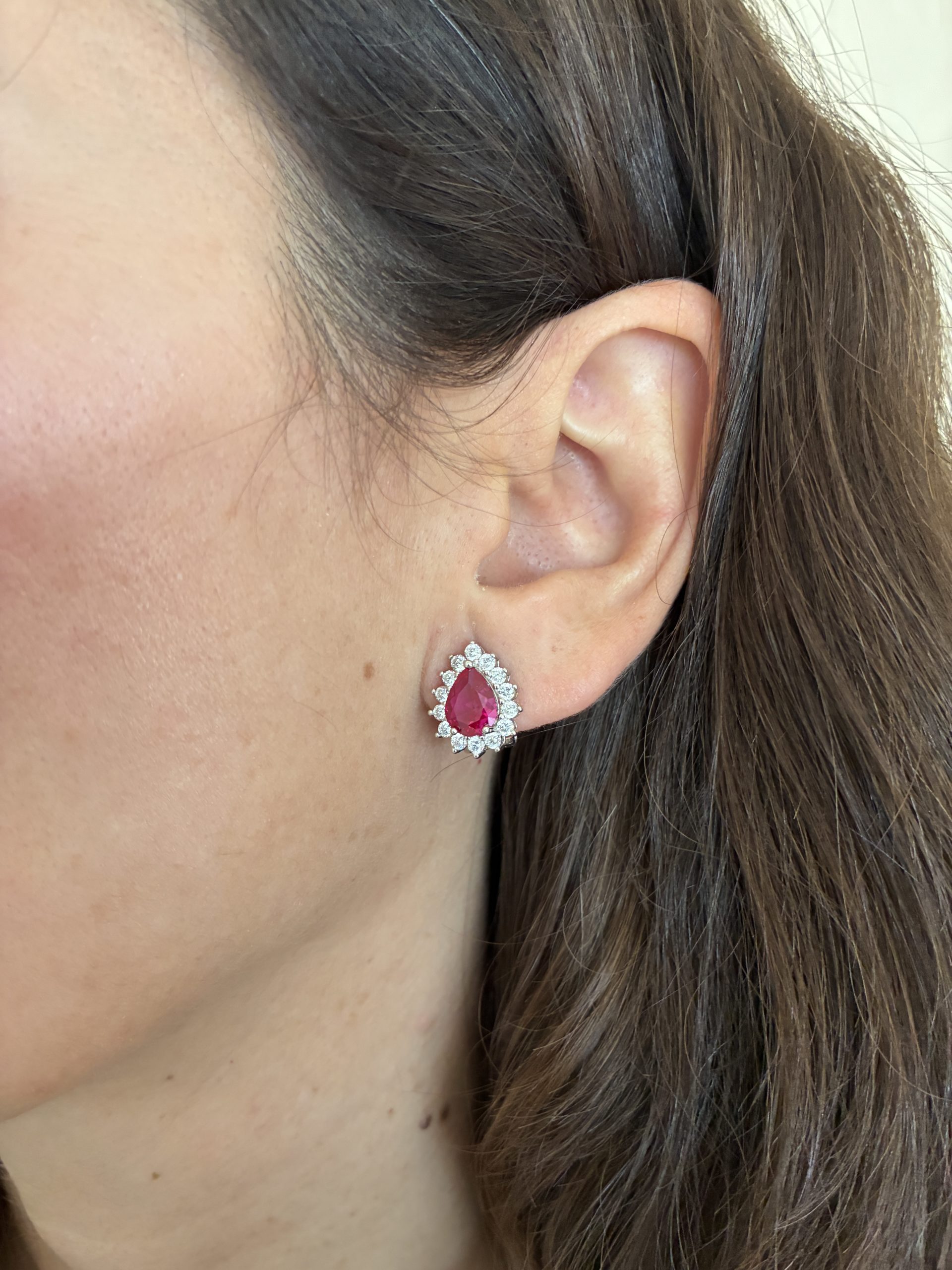 Pendiente de circonita rodidado gota color rubí con garras y cierre omega de 15 mm