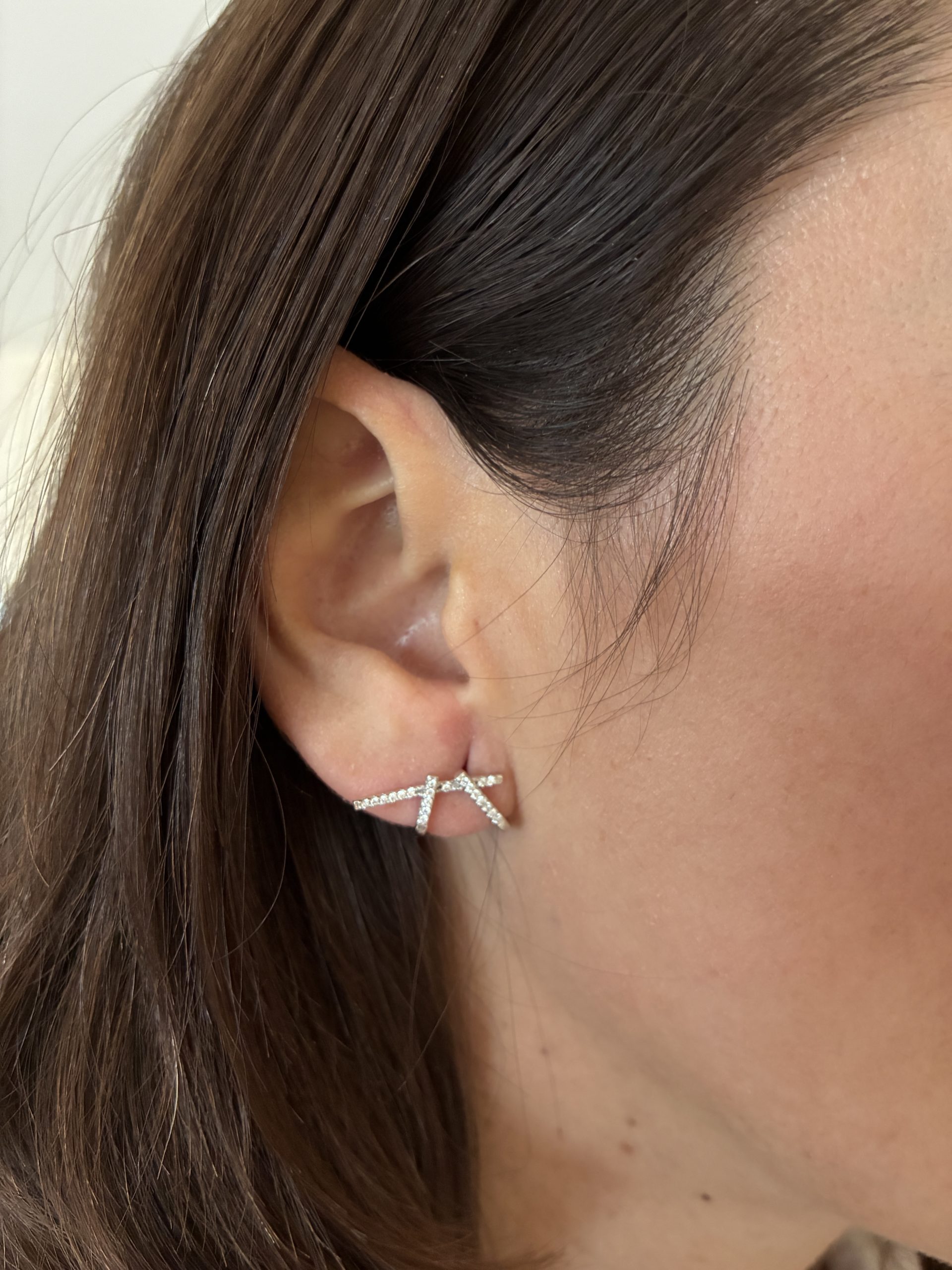 Pendiente de plata con forma de doble daga con zirconitas y cierre presión.