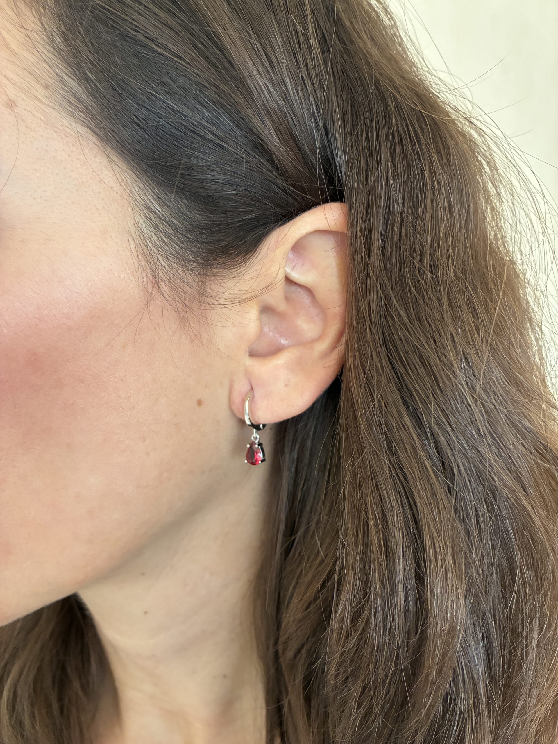 Pendiente de plata rodiado aro de 11 mm con gota de color rojo.
