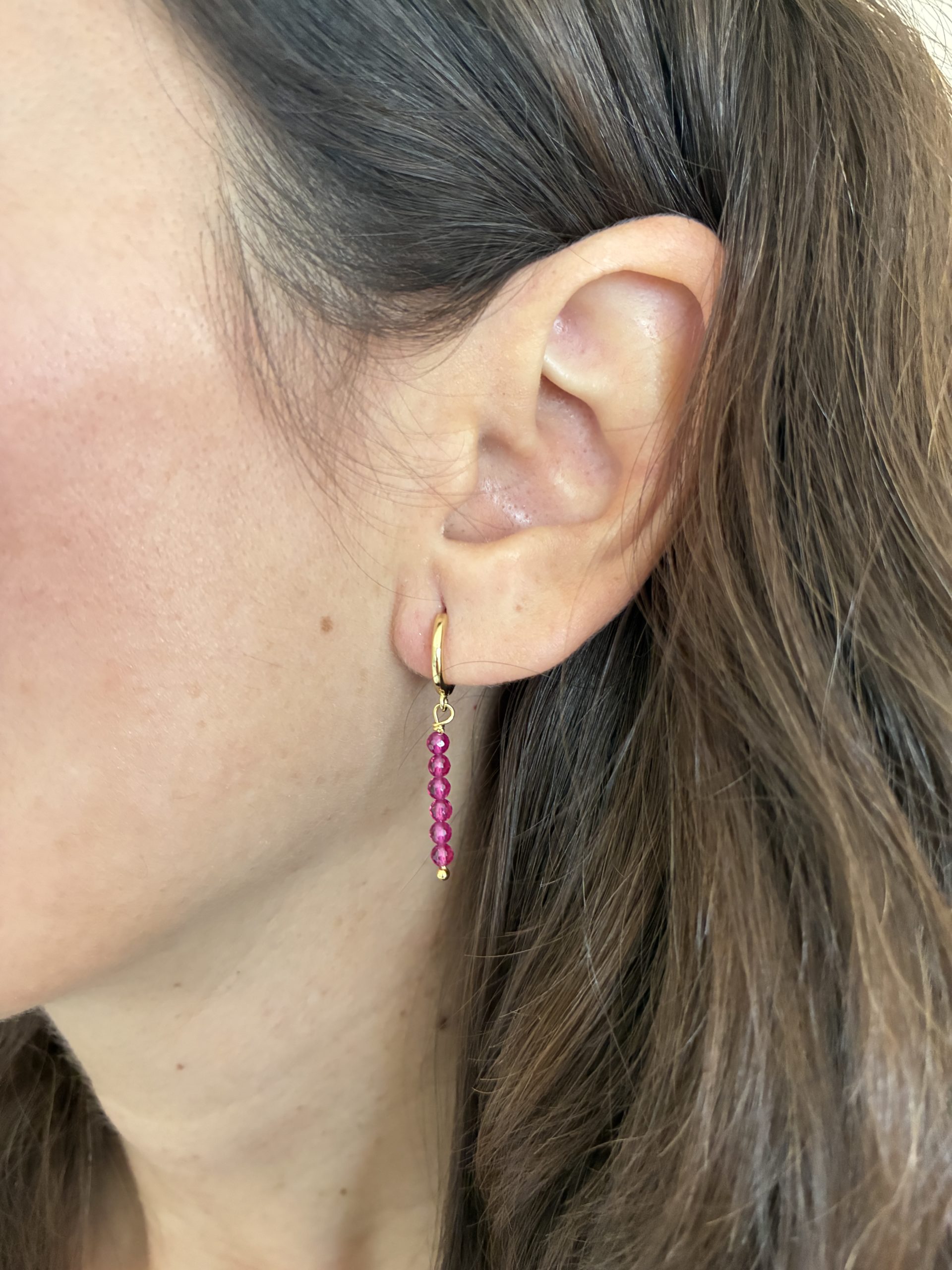 Pendiente piedra natural chapado aro con rubies facetados colgando.